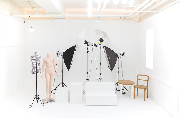 촬영을 지원하기 위해 다양한 소품, 마네킹, 테이블 등 스튜디오 비품이 구비되어